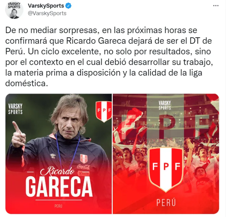 “De no mediar sorpresas, en las próximas horas se confirmará que Ricardo Gareca dejará de ser el DT de Perú. Un ciclo excelente, no solo por resultados, sino por el contexto en el cual debió desarrollar su trabajo, la materia prima a disposición y la calidad de la liga doméstica”, publicó el reconocido periodista argentino.