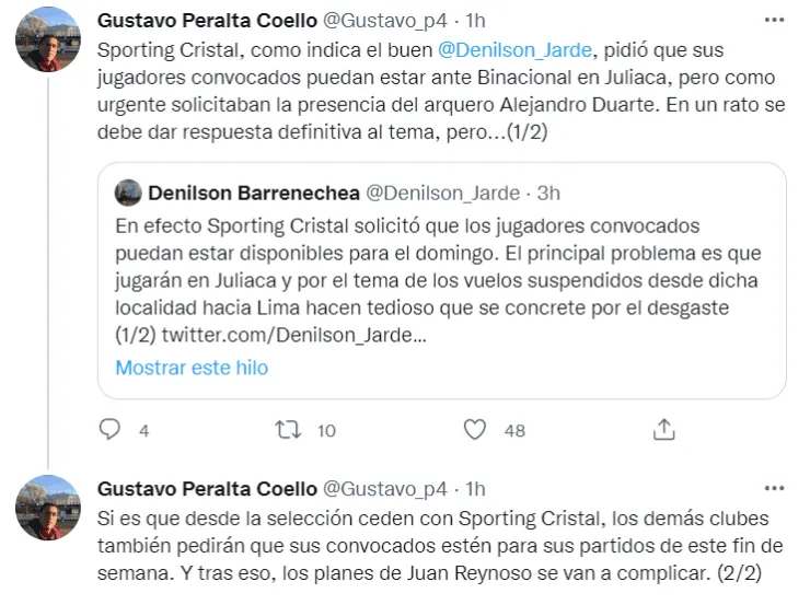 Esta información fue revelada hace unos días por el periodista Denilson Barrenechea, y este miércoles fue corroborada por el comunicadorGustavo Peralta, a través de su cuenta de Twitter, donde dio detallesde la solicitud del club ‘celeste’ que quiere conseguir el Torneo Clausura para luego disputar la final de la Liga 1.