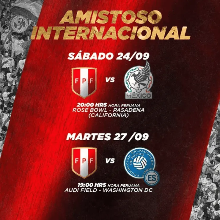 LaSelección Peruanase medirá en un partido amistoso anteMéxicoel 24 de setiembre en el Rose Bowl Stadium de California, Estados Unidos y se podrá ver desde las 20:00 (hora peruana).Mientras que el duelo anteEl Salvador, se disputará el 27 de setiembre en el Audi Fieldde Washington D.C. a las 19:00 (hora peruana).