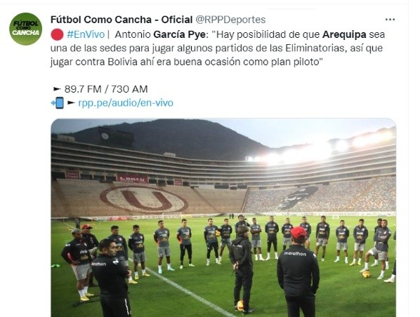 “Hay posibilidad de que Arequipa sea una de las sedes para jugar algunos partidos de las Eliminatorias, así que jugar contra Bolivia ahí era buena ocasión como plan piloto”. destacó Antonio García Pye, gerente de selecciones de la Federación Peruana de Fútbol.