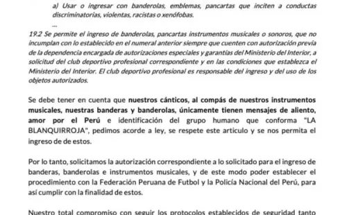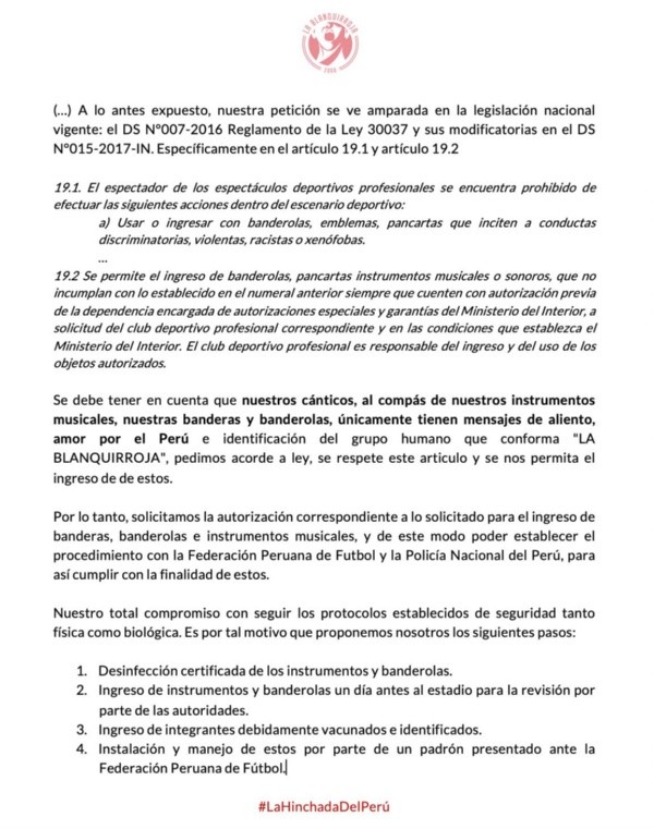 “Hemos presentado a la Dirección General de Gobierno Interior la solicitud de ingreso de banderolas e instrumentos al Perú-Chile. Aquí un fragmento de la misma con nuestro compromiso por cumplir los protocolos de seguridad requeridos. El jueves juguemos todos”.