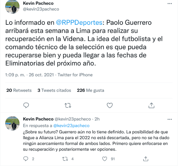 “¿Sobre su futuro? Guerrero aún no lo tiene definido. La posibilidad de que llegue a Alianza Lima para el 2022 no está descartada, pero no se ha dado ningún acercamiento formal de ambos lados. Primero quiere enfocarse en su recuperación y posteriormente ver opciones”, señaló el mencionado comunicador.