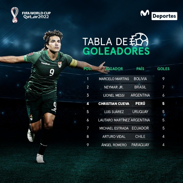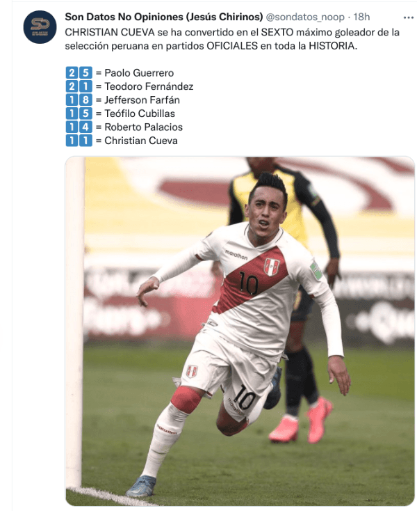 El enganche participó en 4 de los 5 goles anotados por Perú en la fecha doble con jugadas importantes o anotaciones (2). Por todo esto, rompió diferentes récords y además, se puso cuarto en la tabla de goleadores solo por debajo de Martins, Neymar y Messi.