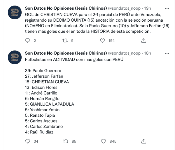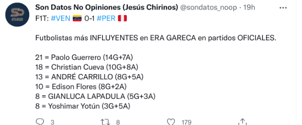 Según Son Datos no Opinioes, en Perú, marcó su gol número 15 y se confirmó como el tercer máximo anotador en actividad solo por detrás de Guerrero y Farfán. En eliminatorias, además, es el tercer máximo anotador de la historia peruana, por detrás de los mismos jugadores.