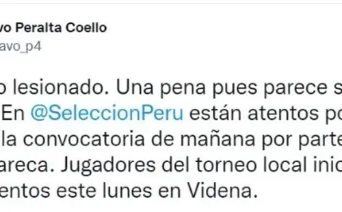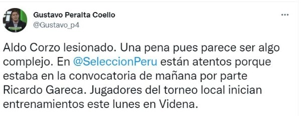 Si la lesión de Aldo Corzo fuera de consideración se tendría que cambiar de planes en La Videna, como se dijo, el lateral estaba en los planes del ‘Tigre’ para esta fecha triple. Posiblemente el llamado sería por Jhilmar Lora, quien ya participó con la selección en la Copa América, desempeñándose en ese puesto o convocará a Oslimg Mora, eso lo sabremos este viernes 24 cuando el argentino dicte los convocados para la ‘bicolor’.