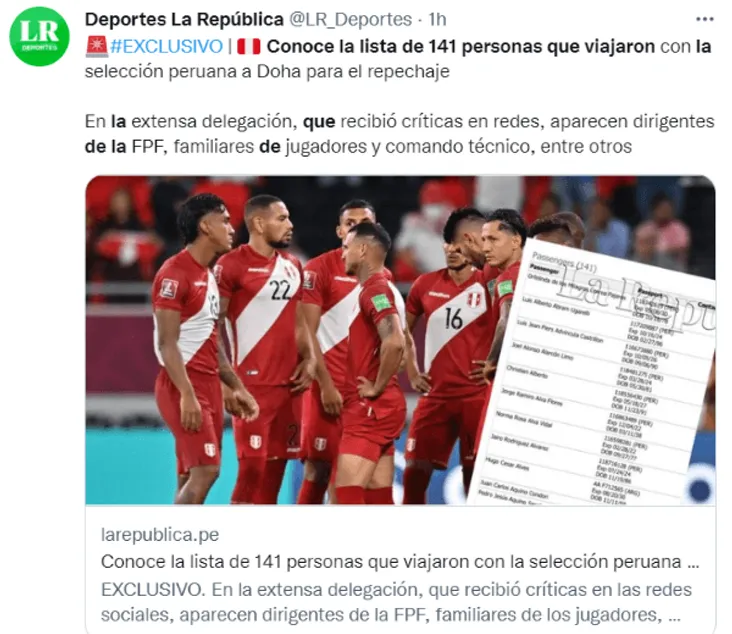 De acuerdo a la información exclusiva publicada por el diario ‘La República’ en su sitio web,fueron 141 personas que viajaron con la Selección Peruana haciaDoha. Según esta información, algunas personas no llegaron junto a la delegación peruana a Barcelona para disputar el amistoso con Nueva Zelanda, sino que hicieron conexión directa aDoha.