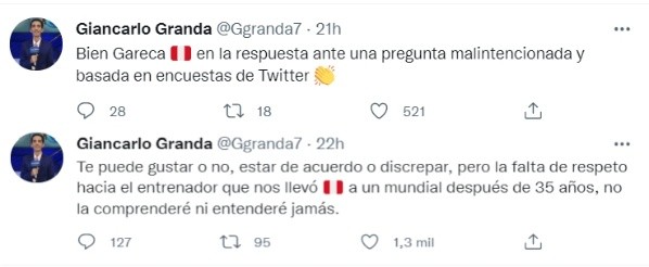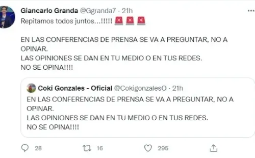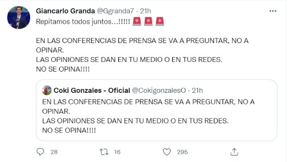 Un periodista realizó una pregunta a Ricardo Gareca, que más que tal fue una opinión sobre, supuestamente una encuesta realizada en Twitter, a los que el narrador Giancarlo Granda puso en su red social: “Repitamos todos juntos…!!!! En las conferencias de prensa se va a preguntar, no a opinar. Las opiniones se dan en tu medio o en tus redes. No se opina!!!!”, publicó el ‘Flaco’ retuiteando lo que dijo el conductor Coki Gonzalez.