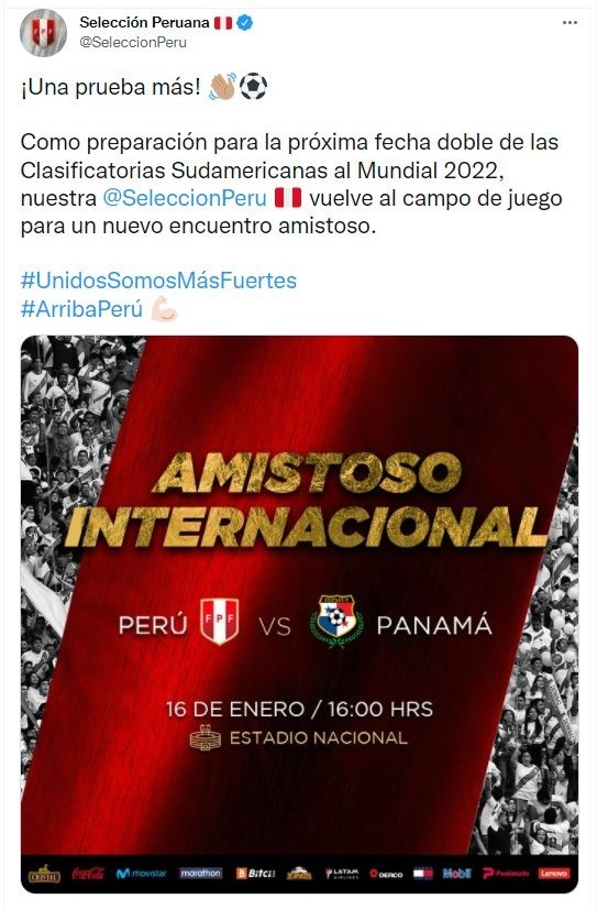 La Selección Peruana afrontará dos duros cotejos como preparación para la doble fecha de las Eliminatorias Sudamericanas a Qatar 2022. A desarrollarse ante Panamá y Jamaica en el estadio Nacional, la próxima seguidilla de partidos podría jugar en contra y por ello los futbolistas necesitan todo el apoyo del público. Así pues, el enfrentamiento ante Panamá se desarrollará el domingo 16 de enero y ante Jamaica el jueves 20 de enero.