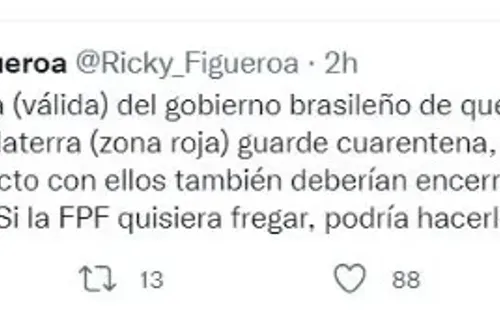 El motivo sería por los jugadores argentinos que militan en la Premier League. Cabe resaltar que en Brasil se ausentaron varios futbolistas que juegan en la liga inglesa, tras no ser cedidos por sus clubes. En es línea, el periodista Ricardo Figueroa indica el por qué pasó esto en el encuentro entre Brasil y Argentina: “Bajo la lógica (válida) del gobierno brasileño de que todo aquel que venga de Inglaterra (zona roja) guarde cuarentena, todos los que hayan tenido contacto con ellos también deberían encerrarse 2 semanas. Por precaución. Si la FPF quisiera fregar, podría hacerlo”.