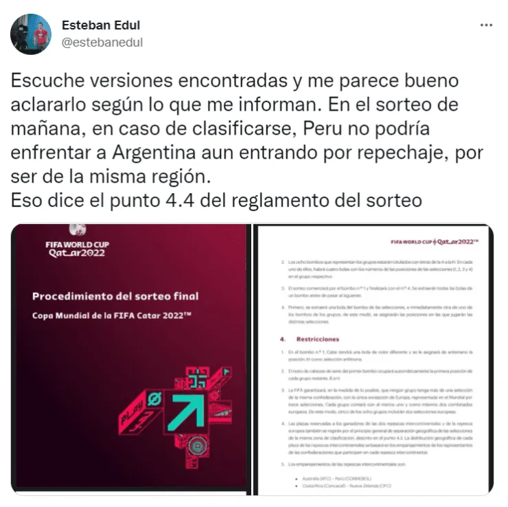 “Escuche versiones encontradas y me parece bueno aclararlo según lo que me informan. En el sorteo de mañana, en caso de clasificarse, Peru no podría enfrentar a Argentina aun entrando por repechaje, por ser de la misma región. Eso dice el punto 4.4 del reglamento del sorteo”, fue el mensaje publicado en la cuenta de Twitter del periodista Esteban Edul de ESPN Radio.