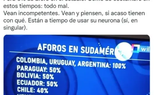 El periodista dijo esto en su cuenta de Twitter: “La vergüenza de Sudamérica gracias al gobierno. Perú 0% de aforo en el estadio. Como de costumbre en estos tiempos: todo mal“, fue lo que publicó Eddie Fleischman en su red social criticando al gobierno del país por tomar esa decisión en el ámbito del fútbol.