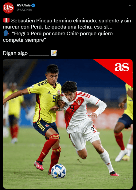 “Sebastien Pineau terminó eliminado, suplente y sin marcar con Perú. Le queda una fecha, eso sí… “Elegí a Perú por sobre Chile porque quiero competir siempre”. Digan algo”. Un comentario donde se aprovechan del rendimiento nefasto, por parte del joven atacante, y su combinado patrio. Razones no les faltan para criticar, pero quizás no era la forma.