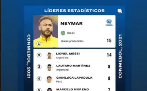 En ese rubro, Neymar es el líder en la posición número uno con quince. Después lo sigue Lionel Messi con catorce. En el tercer puesto aparece Lapadula y Lautaro Martínez (Argentina) con ocho goles producidos. Por último, en la quinta posición, está el histórico Marcelo Moreno Martins de Bolivia con siete tantos.