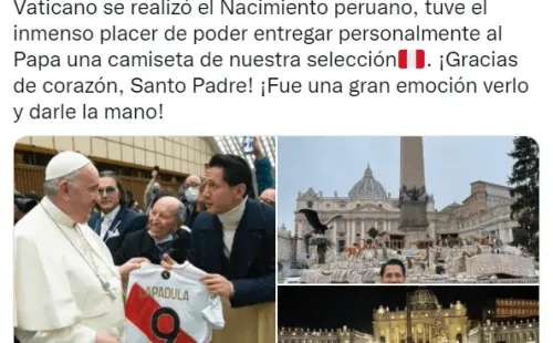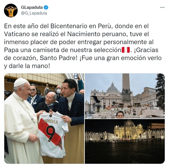 Horas después, el goleador escribió en su cuenta de Twitter: “En este año del Bicentenario en Perù, donde en el Vaticano se realizó el Nacimiento peruano, tuve el inmenso placer de poder entregar personalmente al Papa una camiseta de nuestra selección. ¡Gracias de corazón, Santo Padre! ¡Fue una gran emoción verlo y darle la mano!“.