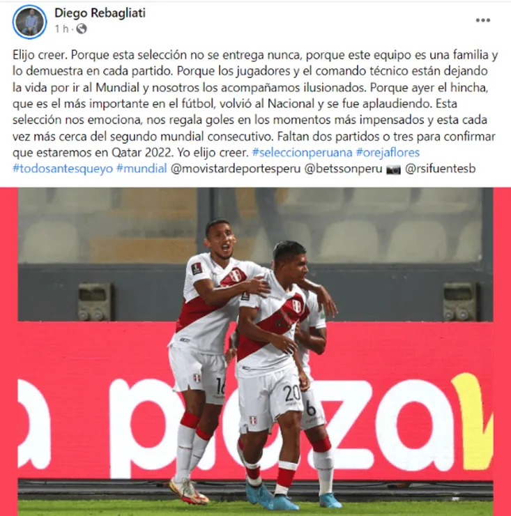 “Elijo creer. Porque esta selección no se entrega nunca, porque este equipo es una familia y lo demuestra en cada partido. Porque los jugadores y el comando técnico están dejando la vida por ir al Mundial y nosotros los acompañamos ilusionados. Porque ayer el hincha, que es el más importante en el fútbol, volvió al Nacional y se fue aplaudiendo. Esta selección nos emociona, nos regala goles en los momentos más impensados y está cada vez más cerca del segundo mundial consecutivo. Faltan dos partidos o tres para confirmar que estaremos en Qatar 2022. Yo elijo creer”, fueron las palabras del reconocido periodista de Movistar Deportes.