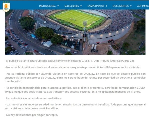 “No se recibirá público con atuendo visitante en sectores de Uruguay. En caso de que se detecte público con atuendo visitante en sectores de Uruguay, el mismo será retirado del recinto por seguridad sin derecho a reembolso o reubicación”, agregaron los uruguayos la nota que publicaron de manera oficial en sus medios.