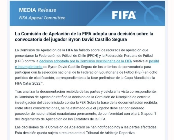 “Según pudo conocer El Comercio, la Federación Peruana de Fútbol (FPF), tras tomar conocimiento de la resolución de FIFA sobre el caso Byron Castillo, acudirá al TAS (Tribunal de Arbitraje Deportivo) para que el ente internacional sea el que tenga la última palabra. En Videna quieren luchar hasta el final en este proceso legal que inició hace varios meses atrás“, comentó la mencionada página web.