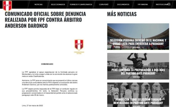 La Federación Peruana de Fútbol habría puesto lo siguiente en la denuncia publicada en sus redes sociales: “La FPF pone en conocimiento que se presentó el último viernes una denuncia contundente ante la FIFA respecto a la actuación del árbitro Anderson Daronco por los hechos públicamente conocidos. La FPF espera pronta respuesta de la FIFA bajo un conducto regular en sus procedimientos”.