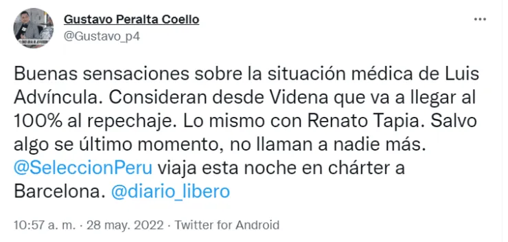 “Buenas sensaciones sobre la situación médica de Luis Advíncula. Consideran desde Videna que va a llegar al 100% al repechaje. Lo mismo con Renato Tapia. Salvo algo deúltimo momento, no llaman a nadie más. La Selección Peruana viaja esta noche en chárter a Barcelona”, reveló el periodista Gustavo Peralta en sus redes sociales.