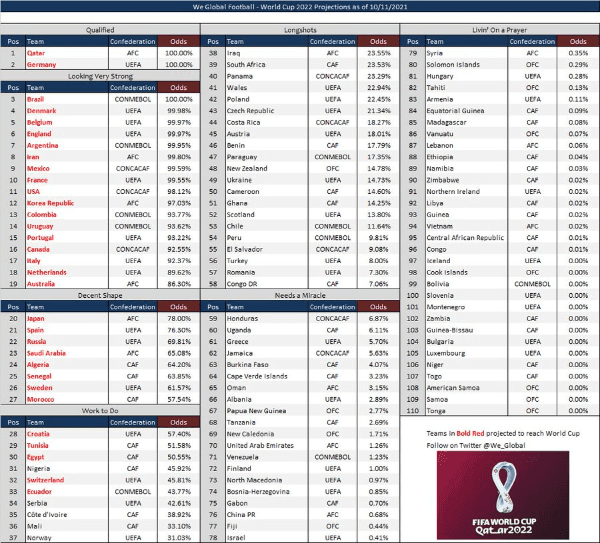 Por eso, Perú está obligado a sumar de visitante en más de una jornada en lo que queda de las eliminatorias. Los números, otra vez, están cuesta arriba. De hecho, una página como We Global sacó una tabla con las probabilidades de cada selección para ir a la próxima Copa del Mundo.
