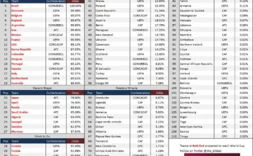 En esa tabla, la Selección Peruana se ve con menos de 10% de opciones, con 9,81% exactamente. En esa misma lista, Chile tiene 11,64%, Paraguay 17,79%, Ecuador 43,77%, Colombia, Uruguay, Brasil y Argentina más de 90%. Acá les dejamos el resumen completo. Estamos tristes, pero sabemos que todo puede cambiar ¡Sí se puede!