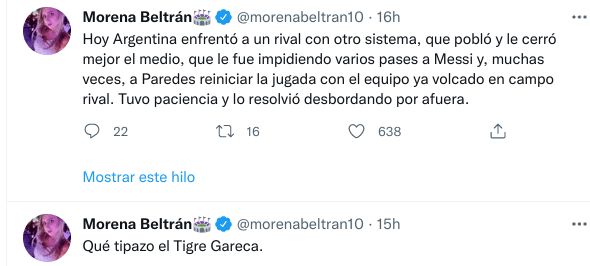 Más allá de lo que puedan decir algunos periodistas o hinchas, el partido de la Sele fue digno. Con el nivel de los de Scaloni, era difícil jugarles de igual a igual y se hizo. Morena Beltrán, de las analistas de fútbol más conocidas de su país, destacó el juego de la Blanquiroja.