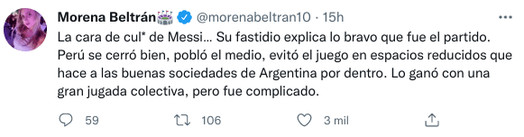 “La cara de cul* de Messi… Su fastidio explica lo bravo que fue el partido. Perú se cerró bien, pobló el medio, evitó el juego en espacios reducidos que hace a las buenas sociedades de Argentina por dentro. Lo ganó con una gran jugada colectiva, pero fue complicado”, escribió para comenzar la comunicadora de ESPN.