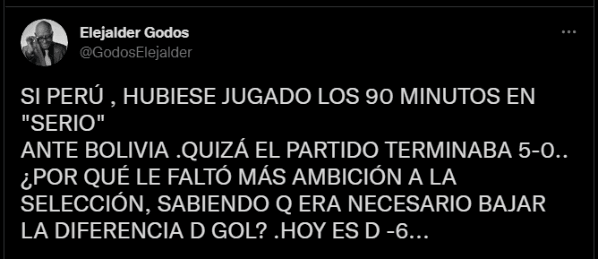 Utilizando su cuenta de Twitter, y con el clásico estilo que conlleva su forma de expresar el comentario, así se mandó ‘El Tío Ele’: “Si Perú hubiese jugado los 90 minutos en “serio” ante Bolivia. Quizá el partido terminaba 5-0 ¿Por qué le faltó más ambición a la Selección? ¿Sabiendo que era necesario bajar la diferencia de gol? Hoy es de -6″. Este mensaje solo tiene un responsable.