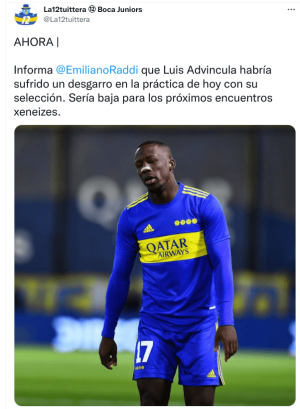 En las últimas horas,se sumó otro ahora para el encuentro contra Bolivia:Luis Advíncula. “Habría sufrido un desgarro en la práctica de hoy con su selección. Es baja para los próximos encuentros xeneizes”, señaló Emiliano Raddi de ESPN.