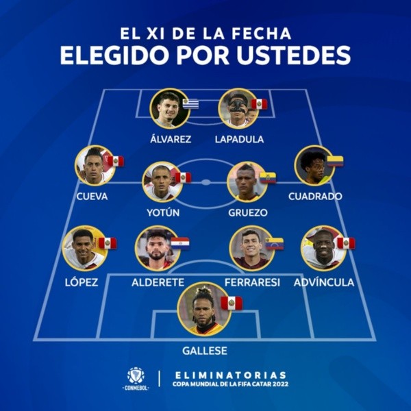 El equipo, al final, tuvo seis peruanos. Gallese, Advíncula, López, Yotún, Cueva y Lapadulafueron los que aparecieron en el conjunto que publicó de la CONMEBOL. Les dejamos todo el once ¡Bien a todos los presentes! ¡Felicidades!