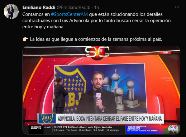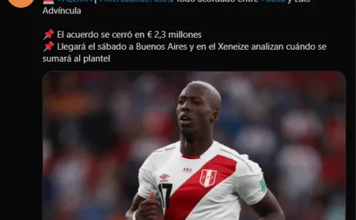El reconocido medio argentino conocido como ‘doble amarilla’ da detalles al respecto: “Alerta. Mercado de pases: Todo acordado entre Boca Juniors y Luis Advíncula. El acuerdo se cerró en € 2,3 millones. Llegará el sábado a Buenos Aires y en el Xeneize analizan cuándo se sumará al plantel”.