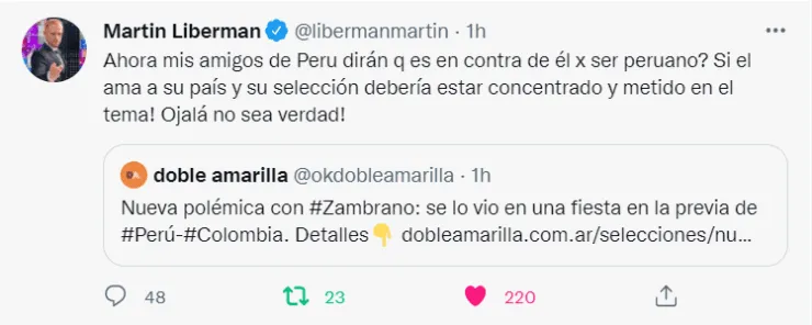 El periodista argentino Martín Liberman volvió a lanzar un dardo contra Carlos Zambrano y esta vez no fue por temas futbolísticos, sino extradeportivos. Esto debido a que este lunes el programa “Amor y Fuego” revelara imágenes comprometedoras del jugador de Boca Juniors, donde se le ve disfrutando deuna fiesta realizada en el sur de Lima. Todo estoa puertas del trascendental duelo que disputará la Selección Peruana ante Colombia en Barranquilla, por las Eliminatorias Sudamericanas rumbo a Qatar 2022.