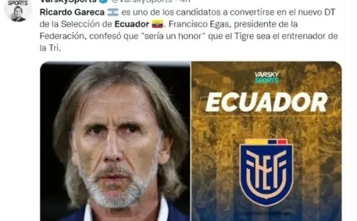 Habiendo marcado una época con la Selección Peruana, Ricardo Gareca es ahora entrenador libre, pero eso estaría cerca de cambiar. Luego de la salida del técnico Gustavo Alfaro, medios reportan que quería ganar 4 millones de dólares al año por dirigir a la Selección de Ecuador, lo cierto es que ahora el ‘Tigre’ es opción número uno e incluso algunos medios se animaron a ponerle ya el buzo ‘Tricolor’.