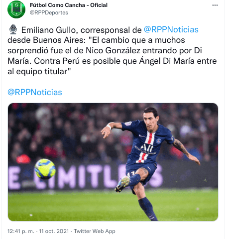 “El cambio que a muchos sorprendió fue el de Nico González entrando por Di María. Contra Perú es posible que Ángel Di María entre al equipo titular”, señaló el comunicador que también señaló que “En Argentina se da por descontado el triunfo ante Perú este jueves”.