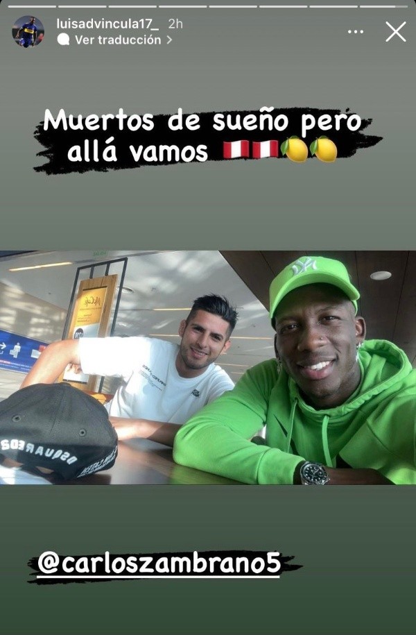 Justamente, en las últimas horas, el lateral derecho Luis Advíncula reportó cómo va su viaje para el Perú. “Muertos de sueño, pero allá vamos”, escribió Bolt junto con las banderas del país y unos limones. Acto seguido, etiquetó a Zambrano.