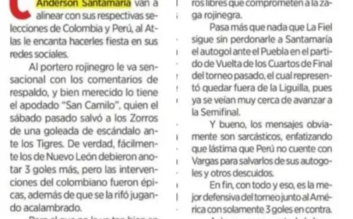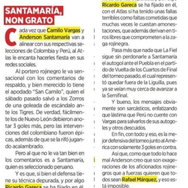 “SANTAMARÍA, NON GRATO”, escribieron por ejemplo para comenzar. “Al que no le va tan bien en los comentarios es a Santamaría, quien es seleccionado peruano”, escribieron. “La Fiel sigue sin perdonarle a Santamaría el autogol ante el Puebla”, concluyen. Acá la nota.