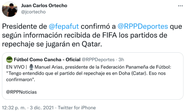 Igual, se comenzó a hablar de la posibilidad de que sean en Qatar en junio. Oblitas manifestó su molestía ante esa posibilidad públicamente. Sin aún confirmación oficial, el Presidente de la Confederación de Panamá señaló lo siguiente: “Tengo entendido que el partido del repechaje es en Doha (Catar). Eso nos confirmaron”. Quizás el de ellos contra Ocaenía se juegue ahí, aunque es posible que el la CONMEBOL también ¡Nada neutral!