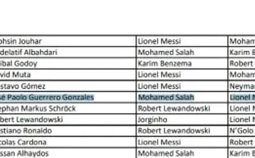 Las votaciones como mejor jugador por parte de Paolo Guerrero fueron, en primer lugar el egipcio Mohamed Salah, seguido por Lionel Messi y el volante del Manchester City, Kevin de Bruyne. El ‘Depredador’ eligió como mejor técnico a Thomas Tuchel, como segunda alternativa a Antonio Conte y finalmente al ‘Pep’ Guardiola.