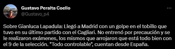 Quien, después de saber de la ausencia del ex AC Milán y Genoa, investigó por su lado, fue el periodista del Diario Líbero, Gustavo Peralta. El también comentarista en PBO Campeonísimo, contó la última hora del delantero ítalo peruano: “Sobre Gianluca Lapadula: Llegó a Madrid con un golpe en el tobillo que tuvo en su último partido con el Cagliari. No entrenó por precaución y se le realizaron exámenes, los mismos que arrojaron que está todo bien con el 9 de la selección. “Todo controlable”, cuentan desde España”.