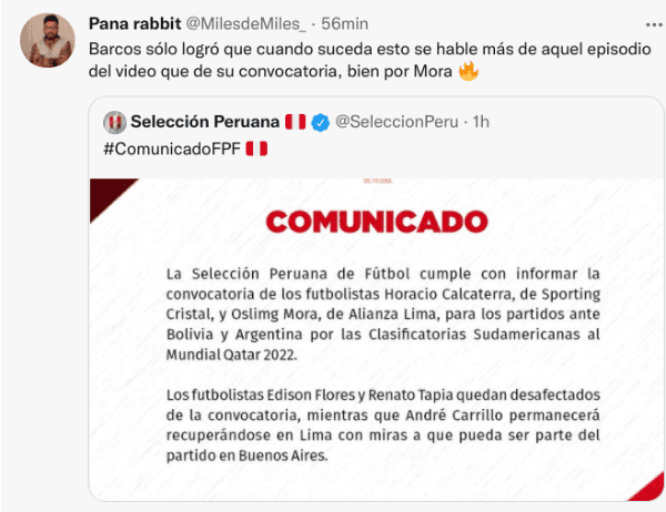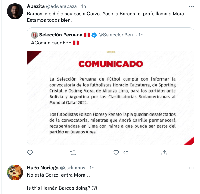 En su lugar, Ricardo Gareca ha llamado a Oslimg Mora, además de Horacio Calcaterra. Con el primero, fue difícil olvidar cuando hace cerca de un mes Hernan Barcos lo pedía a la Selección denigrando las constantes convocatorias de Aldo Corzo. Después de esto, el delantero argentino salió a pedir perdón.