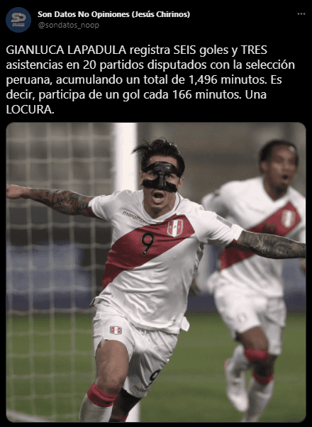 “GIANLUCA LAPADULA registra SEIS goles y TRES asistencias en 20 partidos disputados con la selección peruana, acumulando un total de 1,496 minutos. Es decir, participa de un gol cada 166 minutos. Una LOCURA”. Fue la estadística que soltó ‘Son Datos No Opiniones’, demostrando que el buen ‘Lapa’ está siempre presente en las fotos de alegría, sea anotando o asistiendo. Un crack genial.