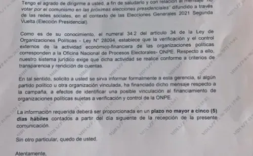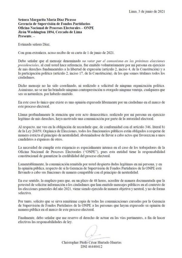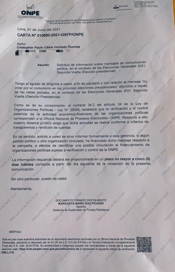 Por eso, la ONPE, según el Comercio, les habría pedido explicaciones, por ejemplo, a Paolo Hurtado y a Raúl Ruidíaz: “Solicito a usted se sirva informar formalmente a esta gerencia si algún partido político u otra organización vinculada, ha financiado dicho mensaje respecto a la campaña, a efectos de identificar una posible vinculación al financiamiento de organizaciones políticas”.