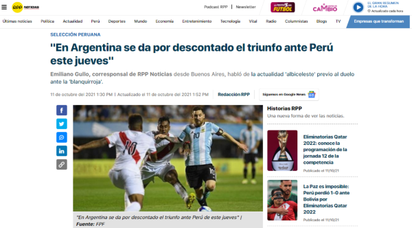 “La gente en Argentina ya está pensando en el Mundial o en la copa que se va a jugar contra Italia. Se da por descontado el triunfo contra Perú, hay mucho de ese ánimo y puede ser arriesgado porque es fútbol”. Comenzó señalando el periodista, quien después contó parte del itinerario para los de ‘El Tigre’.