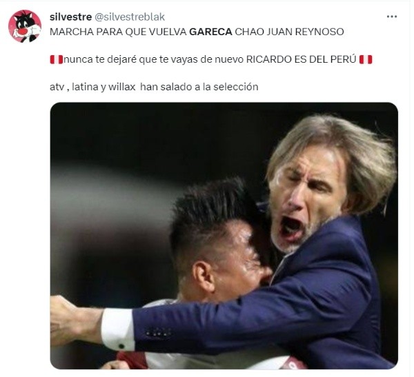 Así pues, y como quizá será una costumbre durante mucho tiempo, los fanáticos de la Selección Peruana pidieron la salida del técnico Juan Reynoso vía redes sociales. Nombrando incluso a su reemplazante, elos fanáticos pidieron el regreso de Ricardo Gareca.