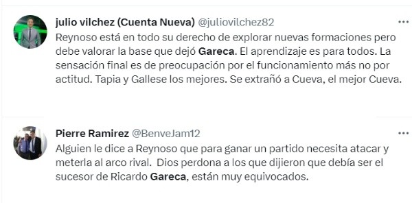 “Alguien le dice a Reynoso que para ganar un partido necesita atacar y meterla al arco rival. Dios perdona a los que dijieron que debía ser el sucesor de Ricardo Gareca, están muy equivocados”, fue uno de los comentarios que se publicaron en Twitter.