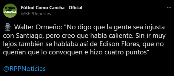 Con todo eso explicado, las palabras de respaldo llegaron desde su familia porque su padre (Walter), en conversación con ‘Fútbol Como Cancha’ lo alejó del ruido: “No digo que la gente sea injusta con Santiago, pero creo que habla caliente. Sin ir muy lejos también se hablaba así de Edison Flores, que no querían que lo convoquen e hizo cuatro puntos”.