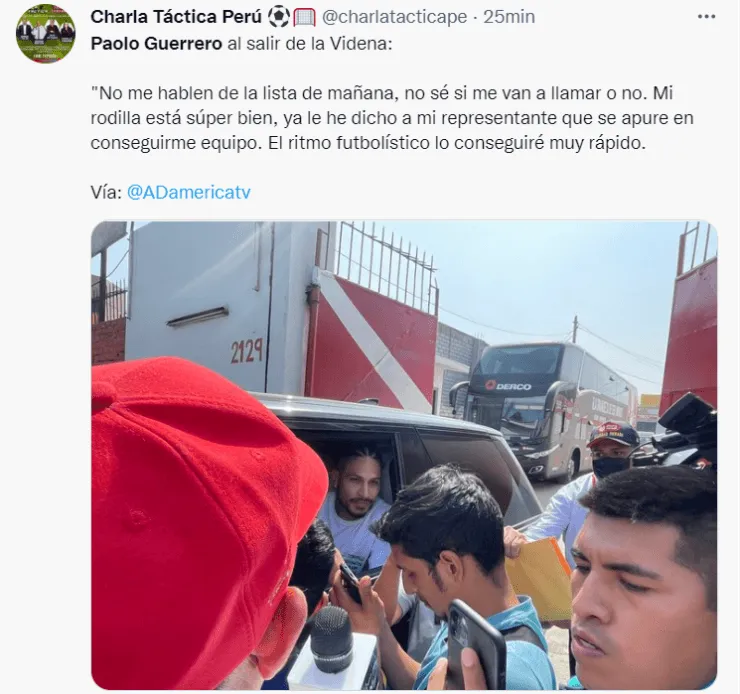Paolo Guerrero, atacante de la Selección Peruana, declaró este jueves para la prensa al salir de La Videna, lugar donde viene entrenando en solitario hasta encontrar un equipo. El atacante nacional señaló que desconoce totalmente si estará en la lista de Ricardo Gareca para el repechaje intercontinental ante Australia/Emiratos Árabes.