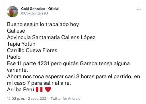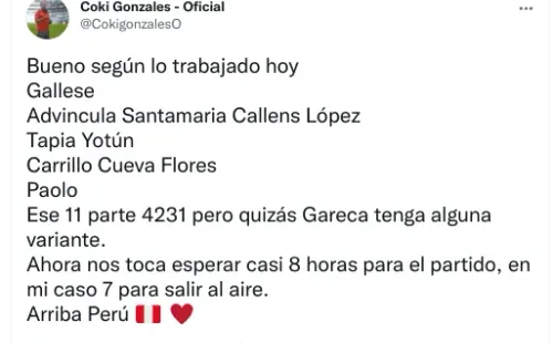 En el último entrenamiento realizado este jueves, a horas del encuentro, el Tigre optó por la siguiente a alineación: Gallese, Advincula, Santamaria, Callens, López, Tapia, Yotún, Carrillo, Cueva, Flores y Paolo Guerrero. Así, se confirmaría el puesto de Flores por la banda esta noche ¡A esperar!