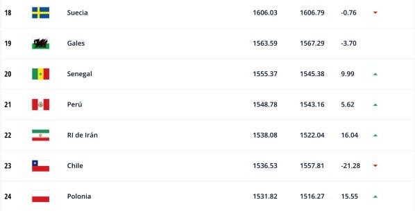 Este jueves, más de una semana después de la jornada eliminatoria, salió un nuevo ranking FIFA. Lo que destacó en este es que el conjunto de Ricardo Gareca pasó por primera vez en su proceso como entrenador a la Selección de Chile. Desde el 2013, que Perú no estaba por encima de su vecino del sur. La Blanquiroja subió un puesto y llegó al 21, minetras Chile está en el 22.