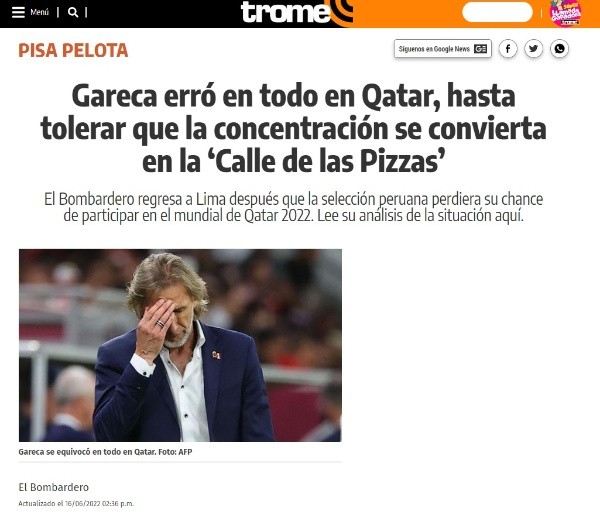 “Pero sobre todo hay dos principales: Gareca se equivocó en todo en Qatar. Hasta permitir que la concentración se convierta en la ‘Calle de las Pizzas’ en la madrugada del partido. Harta gente ‘liquidando’, cantando, ‘tirando maicito’, afanando”, publicó el ‘Bombardero’ en su columna Pisa Pelota del diario Trome.
